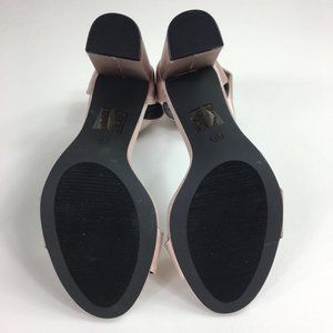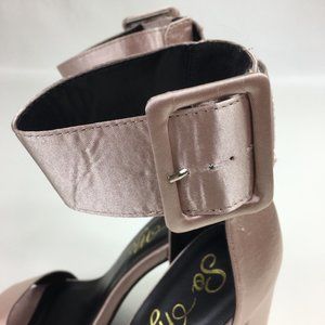 NEVER WORN pink satin heels with buckle at ankle. Size 9. Heel is 4 inches. Few small imperfections on backs of heels.