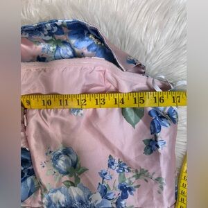 Elegant pink off-shoulder dress with blue floral patterns. Perfect for special occasions.