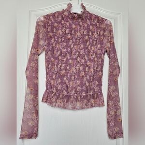 Lulus Sophisticated Blossom Mauve Floral Mesh Smocked Mock Neck Top XS