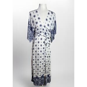 Lulus South of France Blue & Ivory Print Kimono V-Neck Maxi Dress Small Coastal