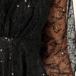 Catch the light as you twirl through the night in the Lulus Sparkling Nights Black Lace Sequin Mini Skater Dress! Darling floral lace, adorned with sparkling black sequins, forms a scoop neckline and a gathered bodice framed by sheer, long sleeves. A high, fitted waist falls to a flirty skater skirt that ends at a mini hem. Hidden back zipper/clasp.