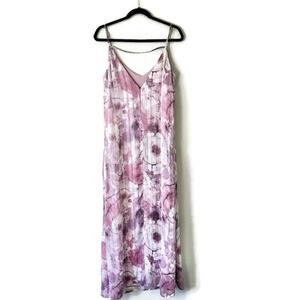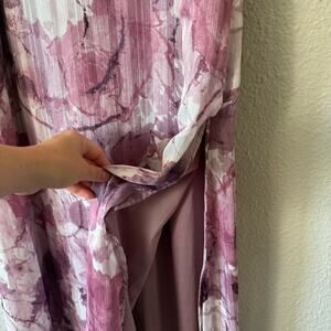 Great used condition! Purple floral maxi dress with two side slits. Sleeveless with adjustable spaghetti straps and dainty thin strap on back. Metallic thread throughout with a textured finish in a v-neck. Fully lined in a relaxed fit. Please note dress is missing sash.