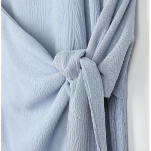 "Stay Sunny Light Blue Faux Wrap Midi Dress" from Lulu's, Size Large. Fits true to size (US 10-12) but has some stretch in it. New with tags; perfect for a summer wedding or garden party. lightweight, breathable fabric. Hits just below the knee in the back and just above the knee in the wrap front.
