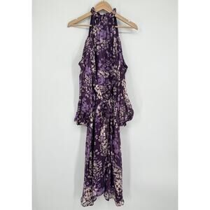 Don't be afraid to flaunt your main character energy in the Lulus Storybook Sweetheart Purple Floral Cold-Shoulder Midi Dress! Airy chiffon boasts shadow stripes, a floral print (in hues of lavender and cream), and gold lurex threading throughout. A ruffled, tying halter neckline carries into a darted bodice, cold-shoulder cutouts, and long sleeves with ruffled, elastic cuffs. A banded waist, with a tying sash, tops a flowy midi skirt with a flirty side slit. Hidden back zipper/clasp.