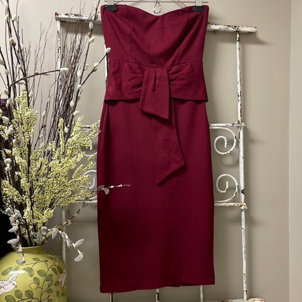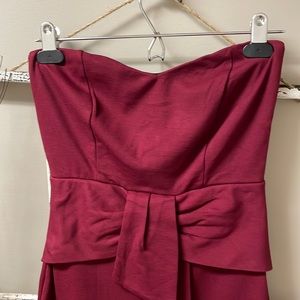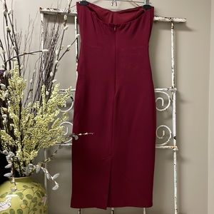 Beautiful Maroon Lulu’s Strapless Dress. Rayon, Nylon, Spandex Blend, split in back, v-neck, accent at waist, worn once! Ladies Size XS, approximately 13.75” across bust and 12” across waist laying flat.