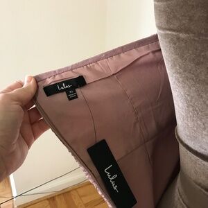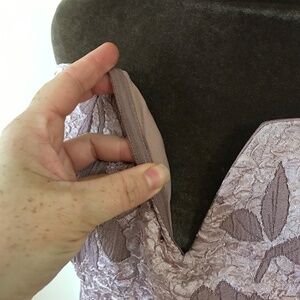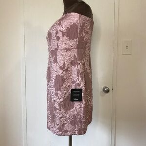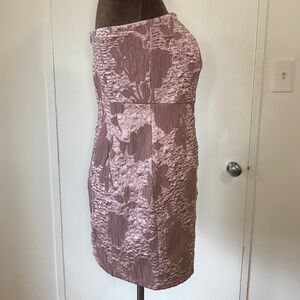 New with tags, only tried on. Cocktail length strapless dress in a dusty pink fabric with a crinkle texture (has the body-smoothing effect of ruching). V-shaped notch in the neckline is reinforced with hidden boning, also boning on the sides. Clear grippy silicone strip all around the top of the dress helps it stay in place. Hidden zipper in back.