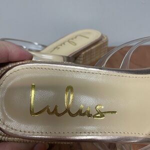 Lulu's Strappy Slide on Sandal, Clear, Rose Gold, Stacked Heel, NWOT, 9M