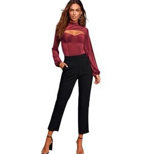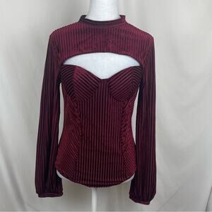 Lulus Striped Sheer Burgundy Feminine Victorian Cut Out Body Suit NWOT Size L