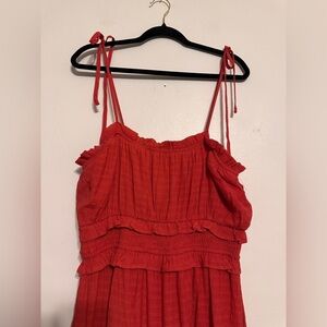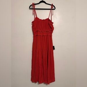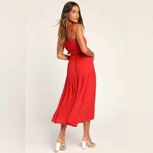 Lulu’s Strolling Santorini Red Tiered Smock Tie-Strap Midi Dress