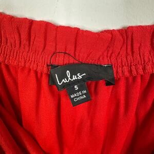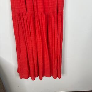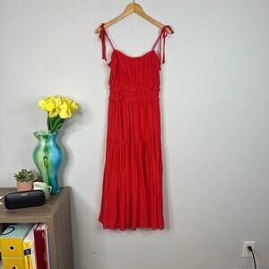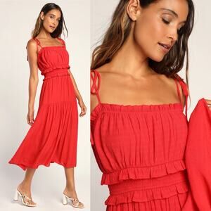 Lulus Strolling Santorini Red Tiered Smocked Tie-Strap Midi Dress. Excellent condition!! Gauzy woven fabric, with a subtle texture throughout, shapes tying spaghetti straps that support a gathered and smocked bodice with ruffled trim. High waist tops a tiered midi skirt that finishes at a breezy midi hem. Y20