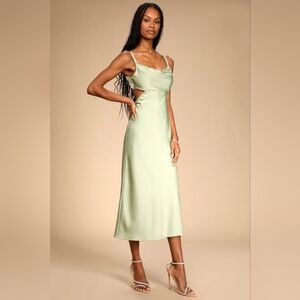 Lulus Stun to Remember Sage Green Satin Cowl Neck Cutout Midi Dress M Wedding NWOT. See all pictures for details.