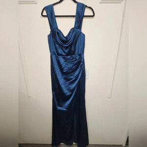Lulus Stunning Arrival Dark Teal Satin Off-The-Shoulder Maxi Dress Wedding. New without tags. Currently SOLD OUT. See all pictures for details.
