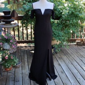 This dress has an incredible silhouette, old Hollywood sophistication. Reminiscent of Pretty Woman, except black. Back zip, fully lined. The bodice has a stand up V with support so it stays that way. The sleeves can be up or off shoulder. Seam at waist, fitted to knees, mermaid at bottom, with a deep 28 inch slit. Size M measures 34 at chest 28 at waist, 36 at hips. 78 at bottom hem. 57 long from shoulder to hem. One of the prettiest dresses in my closet.