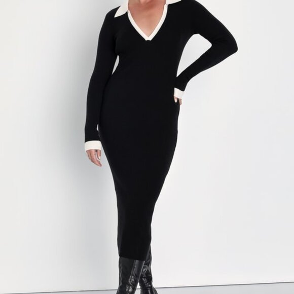 From the office to dinner plans, you'll be the best dressed in the Lulus Successful Sophistication Black Color Block Midi Sweater Dress! Soft and stretchy ribbed sweater knit shapes this ultra-chic dress that features a collared V-neckline, a fitted bodic bodice, and long sleeves. The bodycon silhouette hugs your curves just right as it falls to classy midi hem with a kick pleat at back. Contrasting white knit accents the cuffs and neckline for a stylish color block effect!