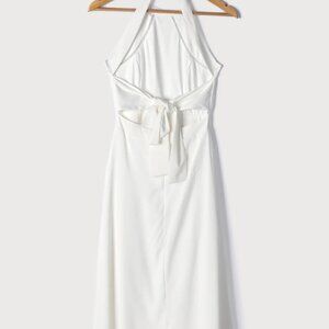 This lightweight woven midi dress was designed to be styled with all your favorite sandals, making it a must-have piece for your summer wardrobe. The princess-seamed bodice features a modified halter neckline with sheer ladder trim accents, while an open back design and long tying sashes complete the flowy A-line design. Hidden back zipper/clasp.
