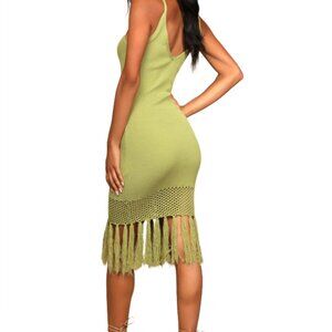Style Tags: lulus dress, festival dress, fringe dress, ribbed knit dress, midi dress, boho chic, summer outfit, vacation style, party dress, casual midi, sleeveless dress, acrylic knit dress, trendy fringe, green dress, spring summer fashion