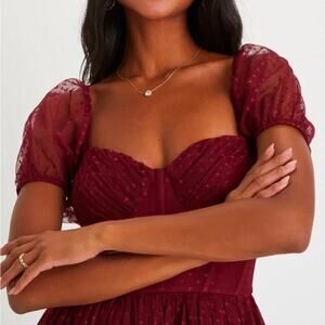 Lulus “Sweet Amor” Burgundy Tulle Midi Dress | Swiss Dot & Bustier Magic | Size M – NWOT & Total Main Character Energy 💃🍷