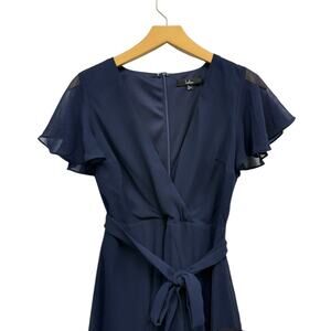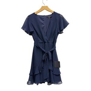Elegant Lulus mini dress in navy blue with fluttery short sleeves and a flattering surplice bodice. The design features a fitted waist with a tie-front and a tiered faux-wrap skirt for dynamic movement.