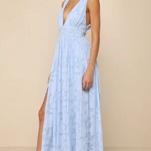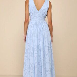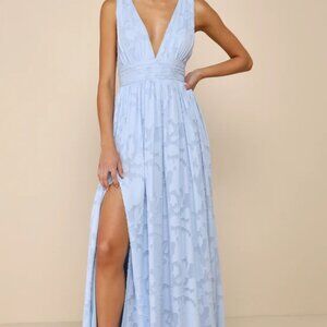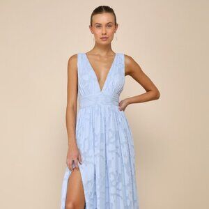NWT, Never worn - When it comes to looking elegant, the Lulus Sweet Sophistication Light Blue Burnout Floral Maxi Dress is at the top of the list! All eyes will be on you with this woven chiffon dress that features a burnout floral design that shapes wide tank straps, a plunging V-neckline (and back), and a gathered bodice. A pleated empire waist continues to a flowy maxi skirt with a thigh-high side slit. Hidden back zipper/clasp.