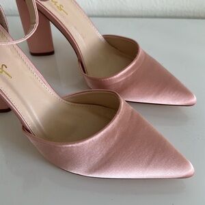 Lulus Syngo Rose Gold Satin Pointed-Toe Ankle Strap Pumps Size 9 Excellent condition