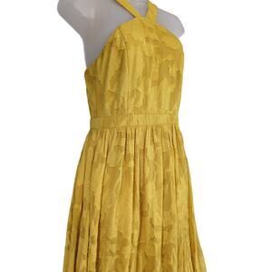 * Features: Wide tank straps, halter neckline, back zipper, princess-seamed bodice, long maxi length skirt, sheer burnout chiffon overlay with rose & leaf designs, inner lining, marigold shade, high banded waist, A-line silhouette