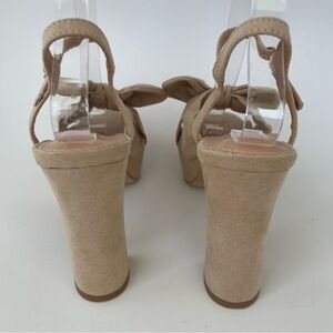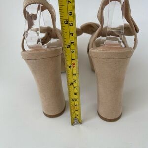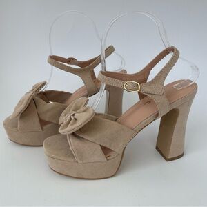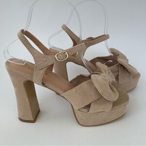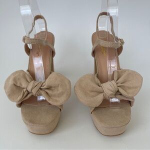 NWOT’S, Lulu's tan platform sandals, showcasing a chic bow detail and a sturdy block heel. Crafted from a suede-like material, these sandals feature a convenient slingback strap with a buckle closure, making them a versatile addition to any wardrobe.