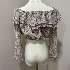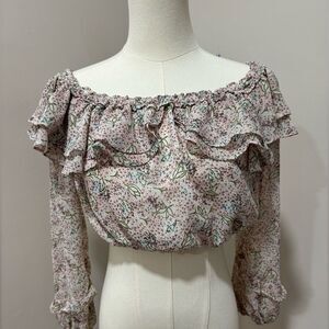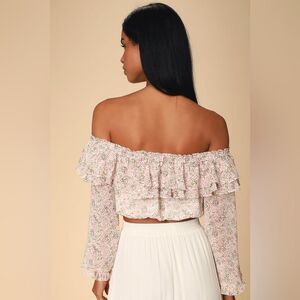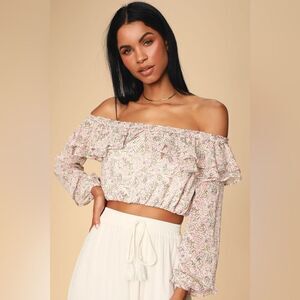 Lulu's Teddi Blush Pink‎ Floral Print Ruffled Off the Shoulder Crop Top Small