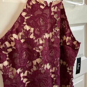 Lulu’s Temps D L’Amour burgundy lace bodycon midi dress. Exposed zipper on the back. Halter style. Fully lined.