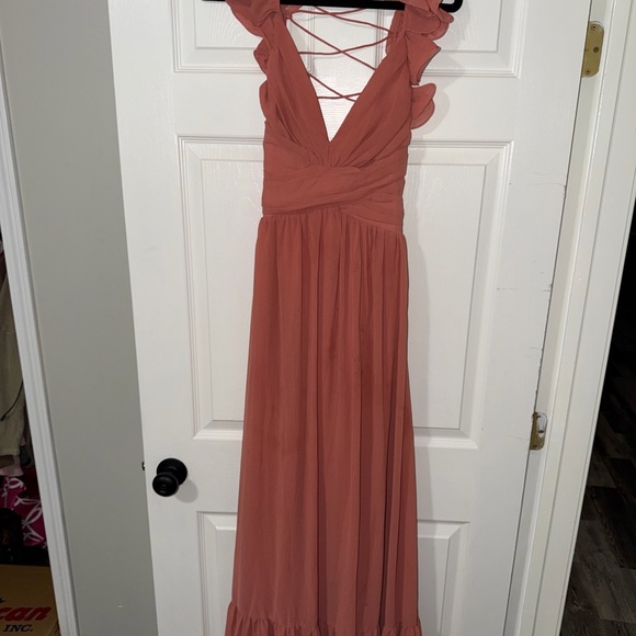 Chic terracotta maxi dress with ruffled straps. Features a criss-cross back design. Ideal for elegant occasions.