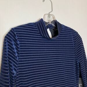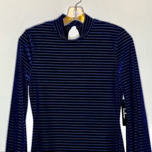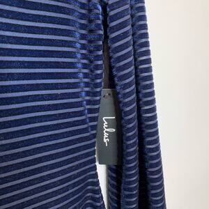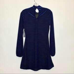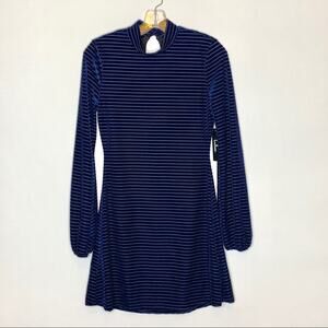 Lulus Ticket to Chic navy blue striped velvety dress. High neckline. Long sleeves with elastic cuffs. Keyhole opening at back neckline. Size XS. NWT.