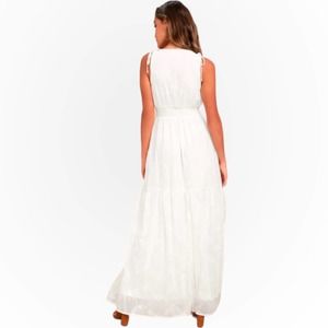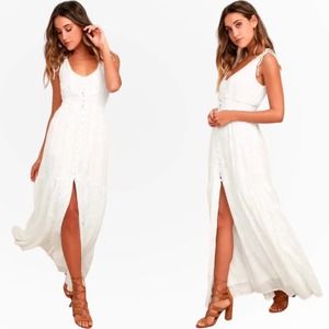 Make each moment in the Lulus Time Well Spent White Embroidered Maxi Dress memorable! Floral embroidery decorates this lovely, woven dress with tying shoulders, a sleeveless bodice, and full loop button placket. Maxi skirt has a smocked waist, pleated detail, and a tiered hem with front slit.