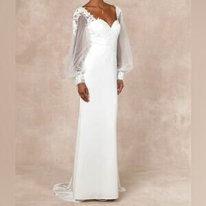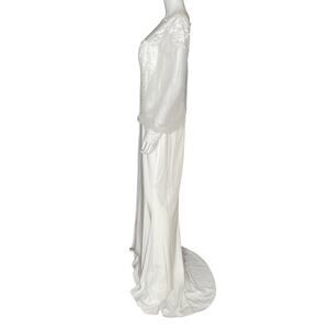 Captivate the room from the moment you step into the aisle in the Lulus Timeless Adoration White Embroidered Bishop Sleeve Maxi Dress! This romantic gown begins with long, bishop-style sleeves composed of airy sheer mesh, with embroidered, loop-button cuffs. Matching floral embroidery adorns the bodice, spilling from the shoulders and down across a sweetheart neckline and a seamed bodice with lightly padded cups. Turn around to reveal a romantic low V-back that's sure to catch your sweetie's eye. Fitted waist sits atop a satin-y flat-woven skirt skirt that cascades to a maxi hem with a graceful train at the back. Hidden zipper/clasp at back.