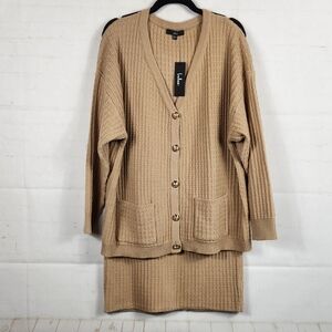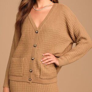 Lulus Toasty Sophistication Two-Piece Oversized Cardi Sweater Midi Skirt Tan M