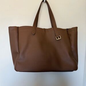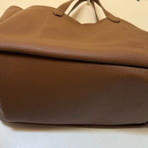 Lulus brown vegan tote. Beautiful gold buckle detail. Light weight. Inside there is one zippered pocket and one open pockets two ties at the top to close the bag. Excellent condition. First seven pictures are from the website and the rest are of the item being sold.