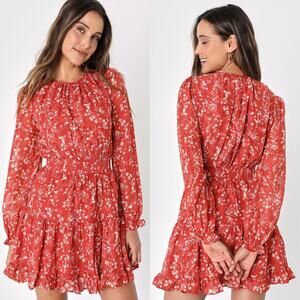 Lulus Too Cute Rust Red Floral Print Smocked Long Sleeve Mini Dress