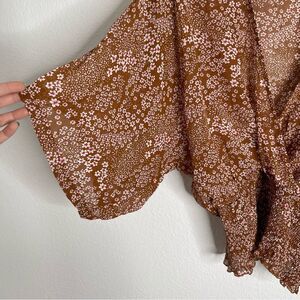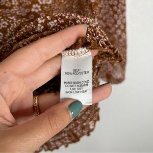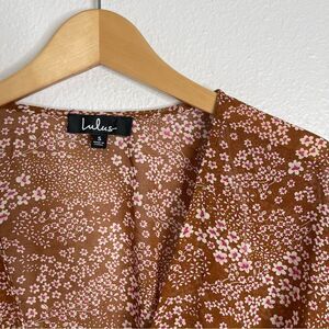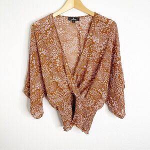 Lulus Top Promises Kept Brown Floral Print Sheer Smocked Shirt Size Small
