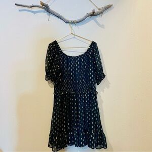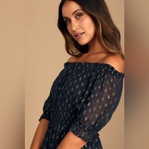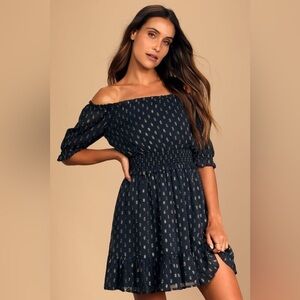 Lulus Exclusive! Make your entrance sparkle with the Lulus Touch of Glam Navy Blue Dotted Off-the-Shoulder Mini Dress! Crinkle-y woven chiffon, with gold lurex clipped dots throughout, shapes this dress with an elasticized off-the-shoulder neckline and puffy short sleeves with elastic ruffle cuffs. A blousy bodice tops a smocked waist and a skater mini skirt.