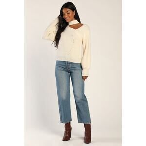 Lulus Trendy Forecast Ivory Pointelle Knit Mock Neck Cutout Sweater NWT