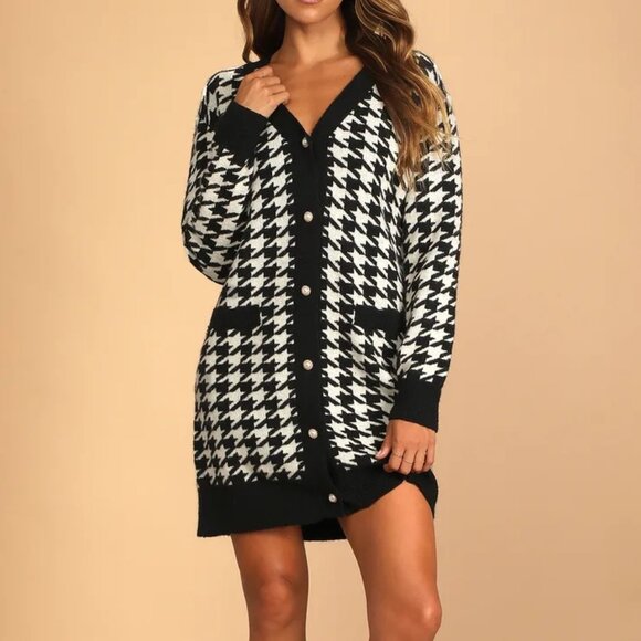 Lulus x LUSH Truly Iconic Black and White Houndstooth Cardigan Sweater Dress