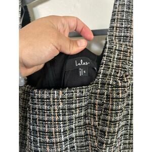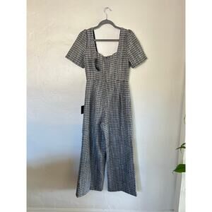 This jumpsuit features a classic black and white tweed pattern, offering a retro yet timeless appeal. The fitted top with short sleeves complements the wide-leg pants, creating a relaxed and flowing silhouette. A defined waistline enhances the overall chic design, making it a versatile choice for various occasions.