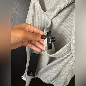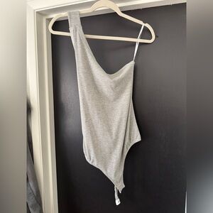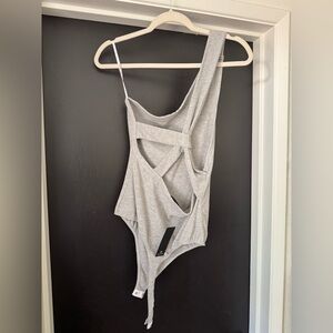Stylish ribbed gray one-shoulder bodysuit with unique twist back design.