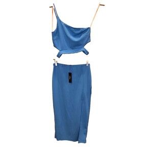 Lulus Two Piece Skirt Set Midi One Shoulder Crop Top Blue L Lined Slit NEW