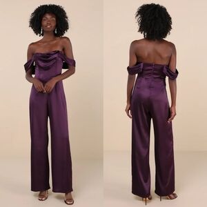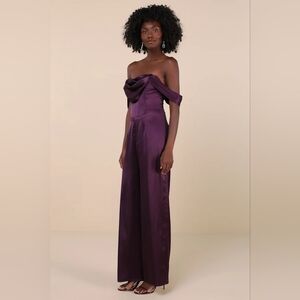 Lulus Unbelievable Aura Dark Purple Satin Off-the-Shoulder Jumpsuit M Wedding. New without tags. See all pictures for details. Currently SOLD OUT online.