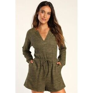 Lulus V-Neck Romper M Olive Green Long Sleeve Drawstring Waist Coquette Y2K