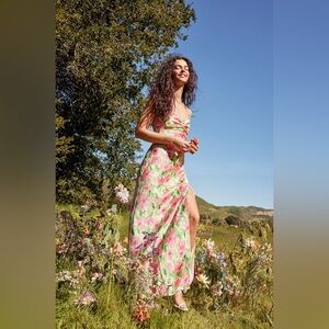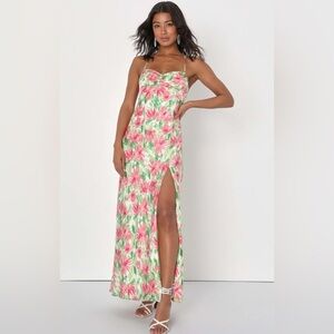 New with tags Lulus Vacay Getaway ivory multi floral print backless maxi dress. Lightweight woven satin with an abstract floral print. Slender spaghetti straps lace up the open back, supporting a lightly pleated bodice with a cowl neckline. Figure-skimming skirt falls through the waist, finishing at a flowy hem with a side slit.