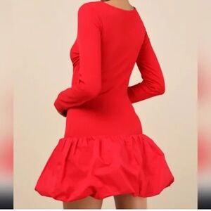 Make a statement in this vibrant red mini dress. Stretchy ribbed knit shapes long sleeves and a boat neckline, while the fitted bodice flows into a cute, woven fabric mini skirt with a playful bubble hem. This dress is perfect for showing off your figure while maintaining a fun and flirty look. Wear it to holiday parties, first dates, or a night out with friends.