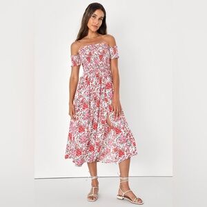 Lulus Exclusive! The Lulus View from the Meadow Cream Floral Print Off-the-Shoulder Dress enchants with its simple sophistication! A kaleidoscope of pink, orange, red, and green floral print covers woven rayon as it forms a smocked bodice with short, off-the-shoulder sleeves. Flowy midi skirt has twin side slits.