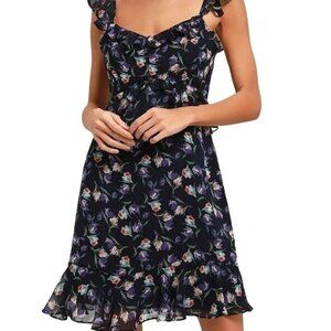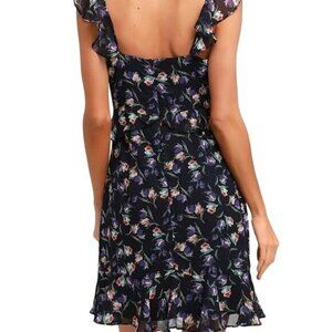 Tags: floral dress, midi dress, Lulus dress, size S, navy dress, polyester dress, ruffle dress, sleeveless dress, women's fashion, elegant dress, zipper closure, floral pattern, lined dress, party, cocktail, summer, spring, floral, flirty, ruffle, mini, date night, romantic, cute