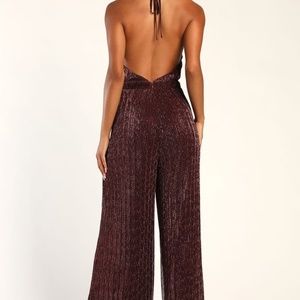 Lulu’s Walk on Sunshine Shiny Plum Wide-Leg Halter Jumpsuit