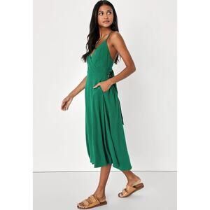 Lulus Warm Afternoons Green Linen Tie Back Midi Dress With Pockets
